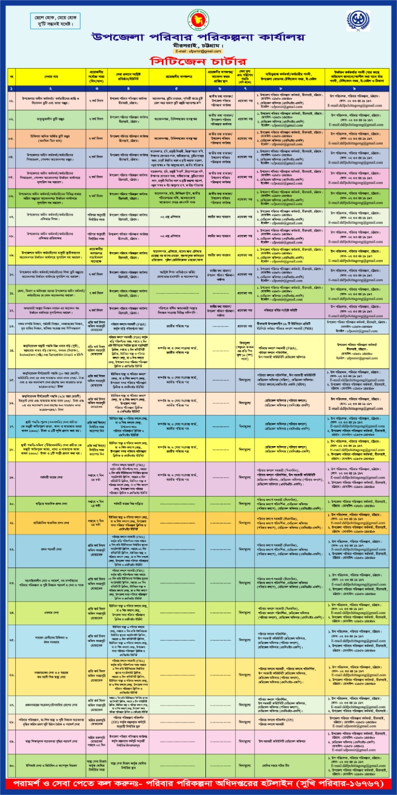 | ০১ | পরিবার পরিকল্পনা বিষয়ক পরামর্শ প্রদান | দায়িত্ব ও কর্তব্য/পরিপত্র | যথাসম্ভব স্বল্পতম সময়ে সেবা প্রদান | পরিবার কল্যাণ পরিদর্শিকা |